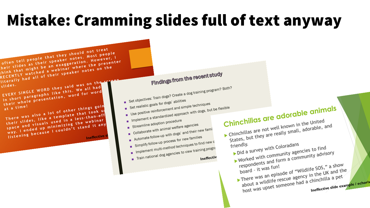 A presentation that fails to give the audience the mental breaks they need to stay engaged…or a presentation packed with content that just falls flat.